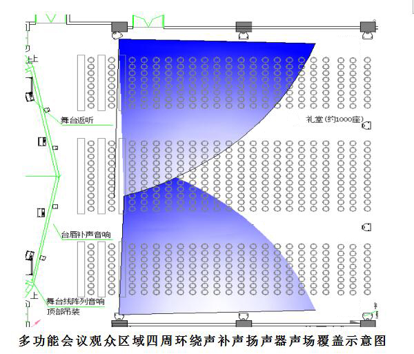 为了使坐在多功能礼堂观众区里不同位置的观众能欣赏到几乎同等素质的声音,在该多功能礼堂舞台台口上方左、右各设一组线阵音响系统,做到左、右声道对整个多功能礼堂观众区的直达声覆盖,舞台台口上方左、右声道每组由6只双8寸无源全频线阵列扬声器和2只双12寸无源超低音扬声器组成,同时考虑到保证多功能礼堂舞台正面前几排观众席不能出现听音盲区的问题,以确保多功能礼堂现场扩声的全频覆盖良好和语音清晰,在台唇位置设置4只10寸全频无源音箱,作为舞台台唇区域补声扬声器组。
