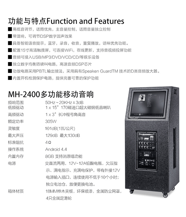 摩登7音响设备MH-2400与之前政府采购的MH-2400拉杆音箱有些许不同,在外形上更加大气稳重,音箱左右两侧均有话筒插槽,演唱使用,运输推拉更方便,15寸高清触摸屏搭载安卓4.4系统,内置商店涵盖海量软件,大功率数字功放板,功能上在原有的基础上添加了WIFI连接可在线下载MTV歌曲内置8GB储存支持消原唱功能,手机音视频投传,可以无线传输手机音视频信号到液晶显示屏上,材质压缩木板,金属防尘网罩,音箱底部配有四个定向滑轮,增加了音箱的便携性,移动到合适的位置时,只需轻踩滑轮脚踏即可锁死滑轮。让上海市广大群众更加热忠参与集体活动,唱出更美的歌曲。