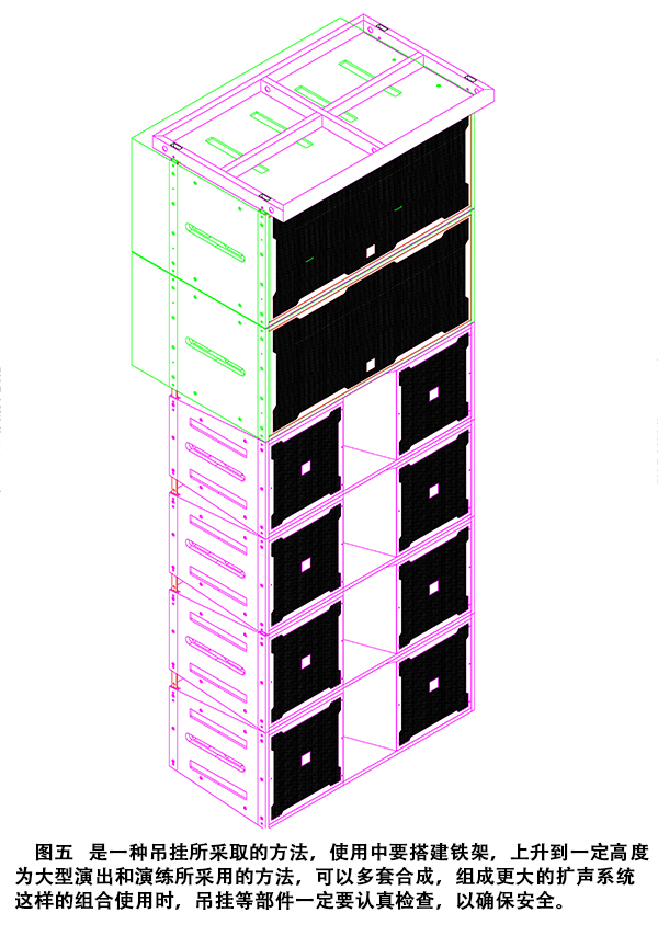 图五,是一种吊挂所采取的方法,使用中要搭建铁架,上升到一定高度,为大型演出和演练所采用的方法,可以多套合成,组成更大的扩声系统,这样的组合使用时,吊挂等部件一定要认真检查,以确保安全。