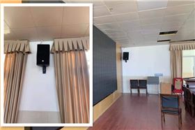 多功能厅主扩声采用4只AT系列15寸专业全频音箱,2只AU系列12寸返听和2只S系列超低音组成,AT系列专业全频音箱,声压级高,失真率低,声音饱满自然;教室四周环绕采用12只S系列10寸的全频音箱辅助补声,均匀分布全场,使整个声场更均匀集中清晰。