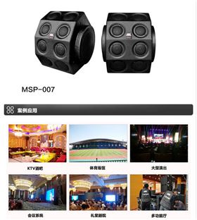 KTV音响MSP-007整个外观处置方向可分为4个平面,每个平面各安装2只中高音喇叭单元,一共有8个中高音单元;水平方向安装有2个10寸喇叭单元,整个箱体几何设计非常科学、紧凑,这种设计给人以“外星来客、强悍、怪异”的感觉,既有专业感,又有神秘感,因此MSP-007被用户称之为“怪兽007”。