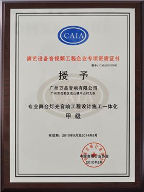 摩登7音响获得由音响行业协会颁发的演艺设备音视频工程企业专项资质证书!