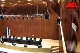 摩登7团队经过对本厅的使用功能分析,考虑使用的音响设备、场地容积等因素,选用了JSL双八线阵音响作为主音箱,该产品声压叠加,衰减小,传输远,精准投射,拥有良好的声场分布和稳定的声音传递,可为多功能厅使用者提供优质体验。
