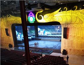 为保证大剧院舞台正面前几排观众席不能出现听音盲区的问题,以确保大剧院现场扩声的全频覆盖良好和语音清晰,在场地四周设置了12只辅助音箱,作为舞台周边区域补声扬声器组。