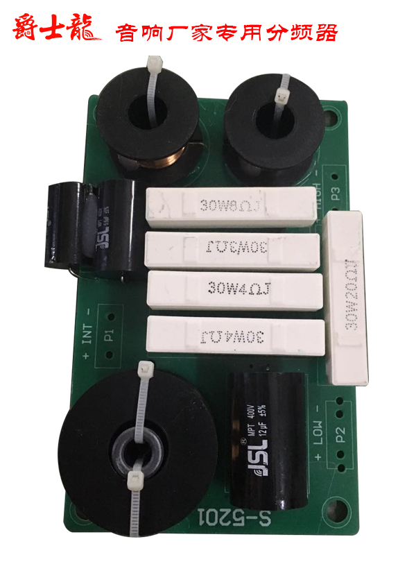 从电路结构来看,分频器本质上是由电容器和电感线圈构成的LC滤波网络,高音通道是高通滤波器,它只让高频信号通过而阻此低频信号;低音通道正好想反,它只让低音通过而阻此高频信号;中音通道则是一个带通滤波器,除了一低一高两个分频点之间的频率可以通过,高频成份和低频成份都将被阻止。在实际的分频器中,有时为了平衡高、低音单元之间的灵敏度差异,还要加入衰减电阻;另外,有些分频器中还加入了由电阻、电容构成的阻抗补偿网络,其目的是使音箱的阻抗曲线心理平坦一些,以便于功放驱动。
