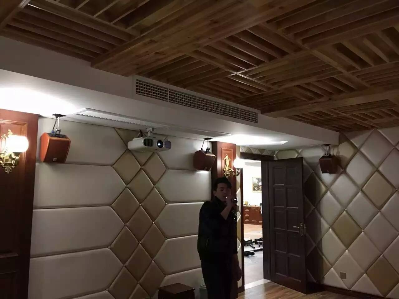 先根据听音环境及沙发的布置确定音箱的位置,专业音响设备5.1系统包括左、右主扩音箱,中置音箱,左、右环绕音箱,低音炮。左右主扩安装在电视机两侧;中置音箱放在中间,一般放在电视机下面;左右环绕在房间后场左右两头;低音炮位置无特殊要求,想要更劲爆的效果一般放在前面。