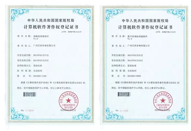 除了产品研发取得科研成果外,摩登7企业在计算机软件方面也取得突破性的发展,分别获得“混响效果器V1.0”和“数字音频处理器V1.0”著作权证书。这对组建音响系统有实质性作用,能让音响系统发挥更加出色的音质效果。