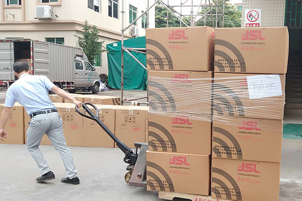 非洲客户定制的GL-12 66只户外防水线阵音响、功放DP10000、超低音箱AS-218 、有源多用途音响TC-15A已发出,在摩登7音响摩登7多个部门的团结协作、共同努力下,顺利装车,并发往客户指定码头。