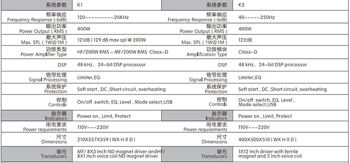 - K2超低频箱体采用了12寸橡胶边玻纤盆双磁钢磁路设计,使低音单元性能大大提高,低频效果赋有弹性和力度,包围感强。 K系列箱体都集成了D类数字功放,24bt-48kHz DSP处理器。 带有4种音效模式,可根据实际应用自由选择,功放板具备4种保护机制(软启动,直流保 护,短路保护,过热保护),让K系列产品的使用稳定保障。 K系列产品箱体紧凑轻便,可根据不同的应用场合灵活搭配。