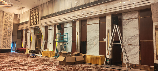考虑到东莞珠江国际酒店宴会大厅空间大、活动类型多样,我司专业团队深入调研,采用线阵列音箱,均匀分布在宴会大厅四周,确保声音能够全面、均衡地覆盖每一个角落,无论是前排还是后排的宾客,都能有清晰的听觉体验。同时,配备了专业的音频处理设备,可根据不同活动场景快速调节音效。