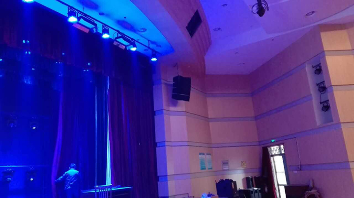 为发展需要,更好的服务广大慈溪市民,近日慈溪市滨海区影剧院新建落成,求购全套专业舞台音响设备,院方货比三家,最终选择与摩登7音响厂家合作。为了达到理想的影视听效果,摩登7音响工程师进行了实际勘查,了解到该影剧院拥有364个座位,为满足每一位听众的视听需要,现场扩声系统采用JSL 4+2线阵模式,8寸的线阵音箱,舞台使用配套的双十八寸超低音音箱和4只返听音箱,为了保证了观众席区域的声场均匀,使用了4只中场补声音箱,2只12寸音箱做后场补声,让每一位观众都能感受到电影带来的震撼感觉,考虑院方有时候需要举办舞台剧表演,还加装了12只射灯,让整体效果更加有层次感。