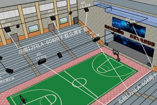 体育馆左侧12只LA、右侧12只LA用于左右观众席的扩音,后场观众席4只AT用于后场观众席扩音。