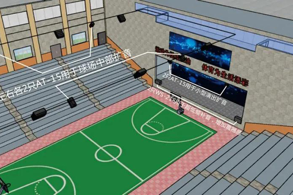 体育馆内音箱的布置方式有集中式、分散式和混合式等6种。采用分散式布置,音箱离观众席的距离最近,声音清晰度高,声场均匀,但声像一致性稍弱。采用集中式布置,音箱离观众的距离较远,为了提高声音的清晰度往往需要选用指向性强的音箱,声场分布也不易均匀,但声像一致性高。根据焦作一中体育馆的建筑结构,摩登7团队为其采用了分散式音箱布置方式,为提高体育馆扩声音质减少空场混响时长,摩登7团队进行了扩声设备选型和顶部吸音体布置方案设计,24只LA线阵作为主扩声朝向观众席,10只AT系列全频后补音箱和2只WS超低音箱面向主舞台,声强增大的同时声场分布更加均匀,增强场馆扩声系统的声像一致性。
