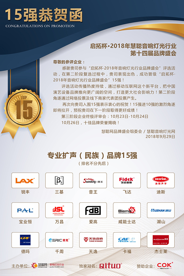 2018年音响灯光行业品牌评选第二阶段经过半个月的激烈角逐,通过线上+线下实名投票,在9月28号下午17::00正式诞生15强品牌,摩登7音响以排名最好的成绩再一次晋级。将迎来十大品牌的最后挑战。